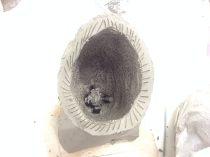 Fill base with dry pieces then turn, cut off top, hollow